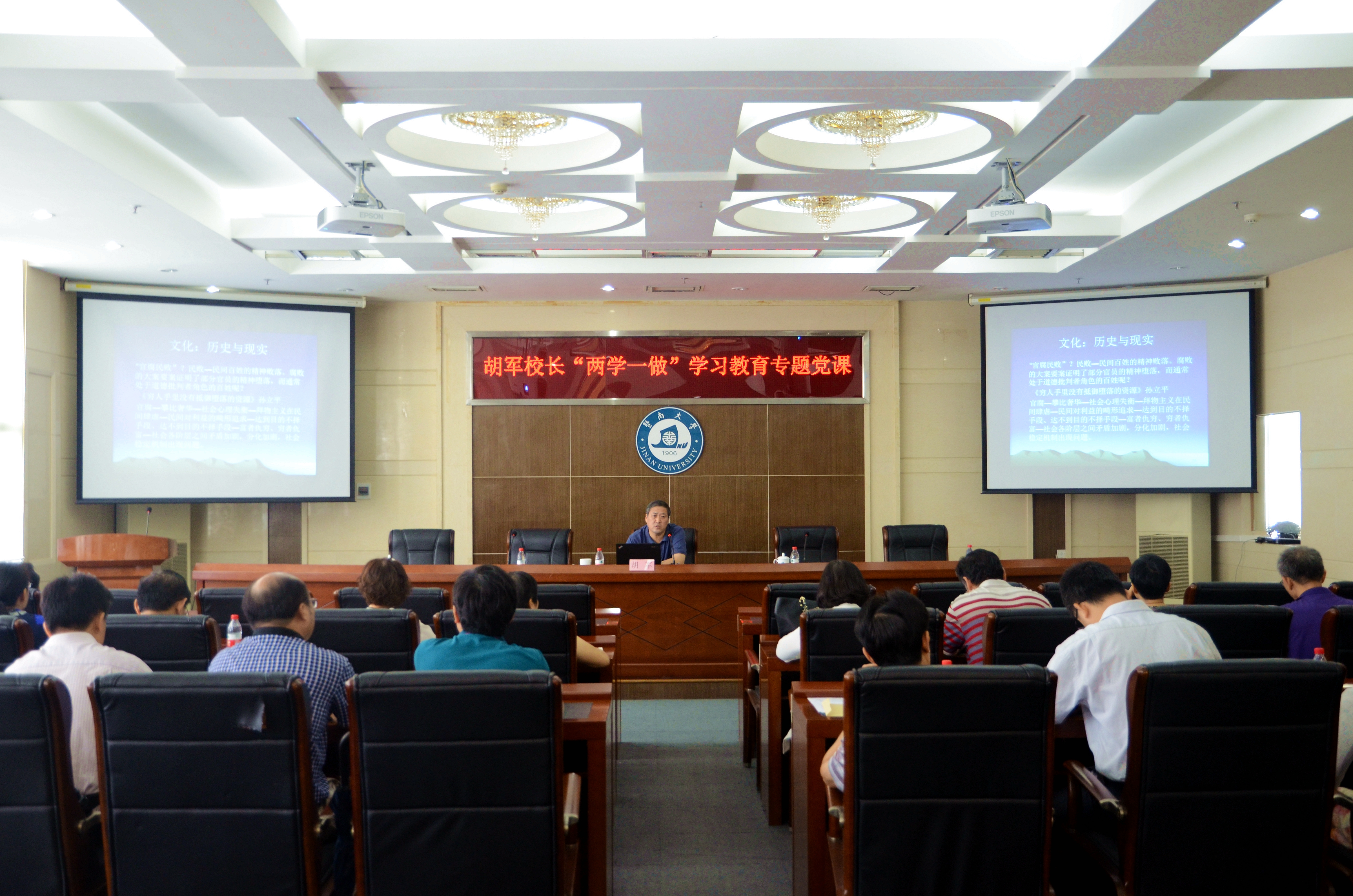7月14日上午,胡军校长在行政楼1111会议厅讲授“两学一做”学习教育专题党课。校党委书记林如鹏、各基层党委书记、校直属党总支书记及党政办公室党支部全体党员到场听课。